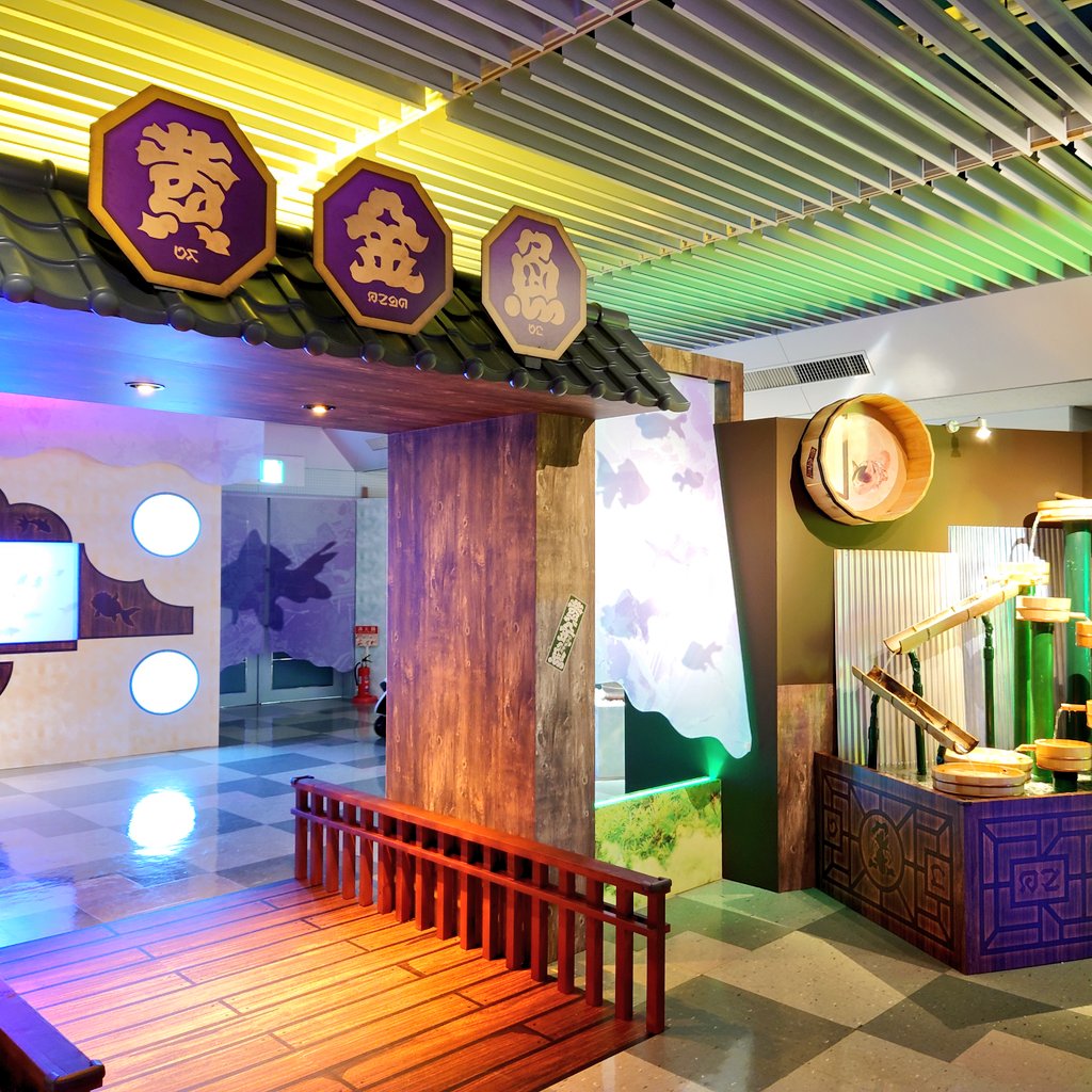 金魚は洋の東西を問わず黄金の魚と認識されてきました。今回の特別展では金魚を「黄金魚」(こがねうお)と呼び、「夢幻」(むげん)と題した異世界を表現する造作のなかで展示します。本館クラゲの展示エリアからマリンホールに入ると、通常の海水魚が主軸の展示とは違った水槽形状と異世界を表現した造作で夏の特別展を彩ります。