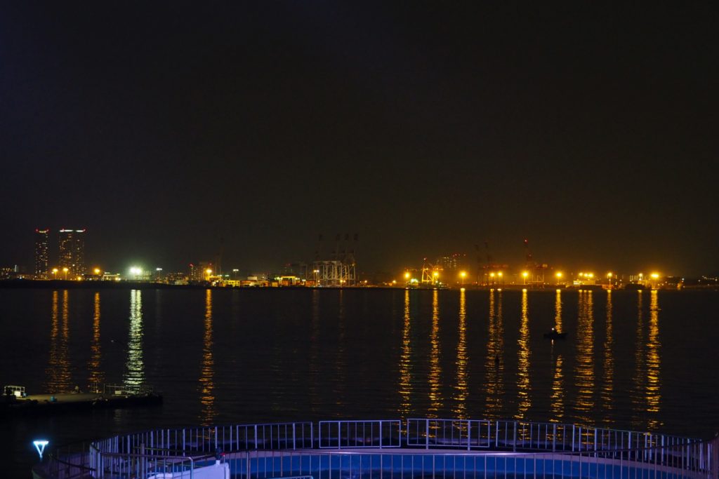 夜のイルカショーは博多湾の夜景をバックに
